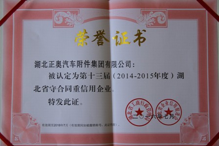 湖北正奧汽車附件集團有限公司榮獲2014--2015年度省級 “守合同重信用企業(yè)”榮譽稱號,此次評選省級“守合同重信用企業(yè)”是由湖北省工商行政管理局和湖北省行業(yè)信用促進會聯(lián)合評選并授予,此次獲獎也是我公司連續(xù)多年獲得“守合同重信用企業(yè)”稱號。